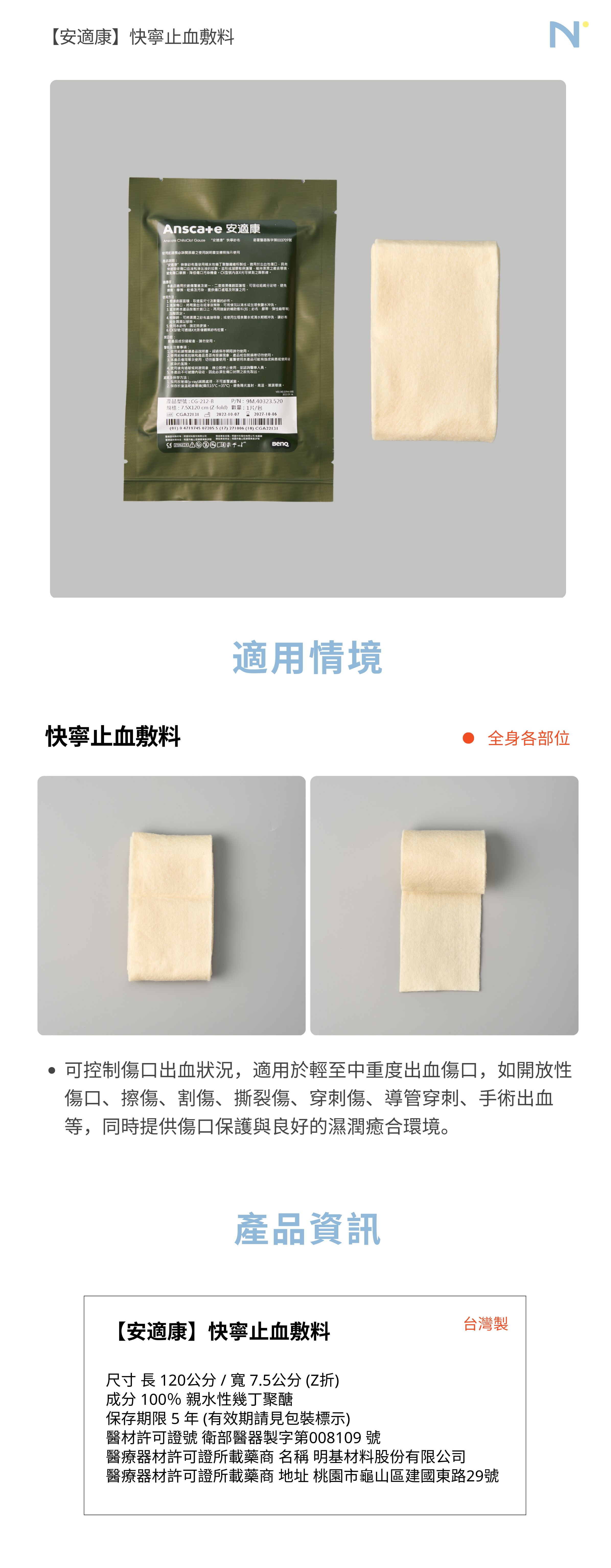 內容物:快寧⽌⾎敷料